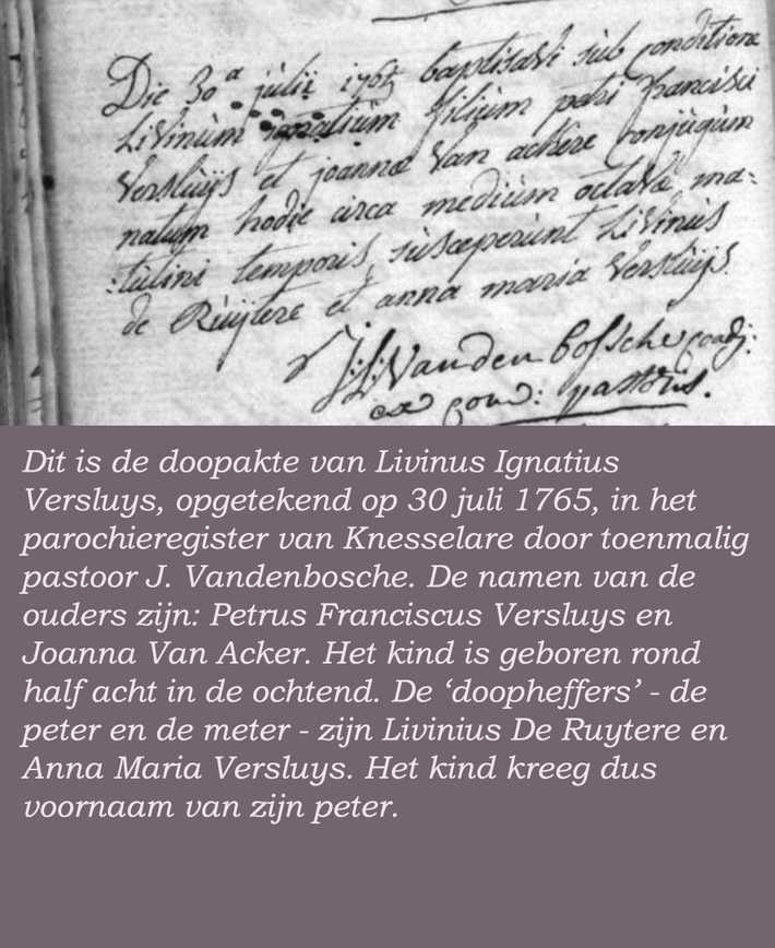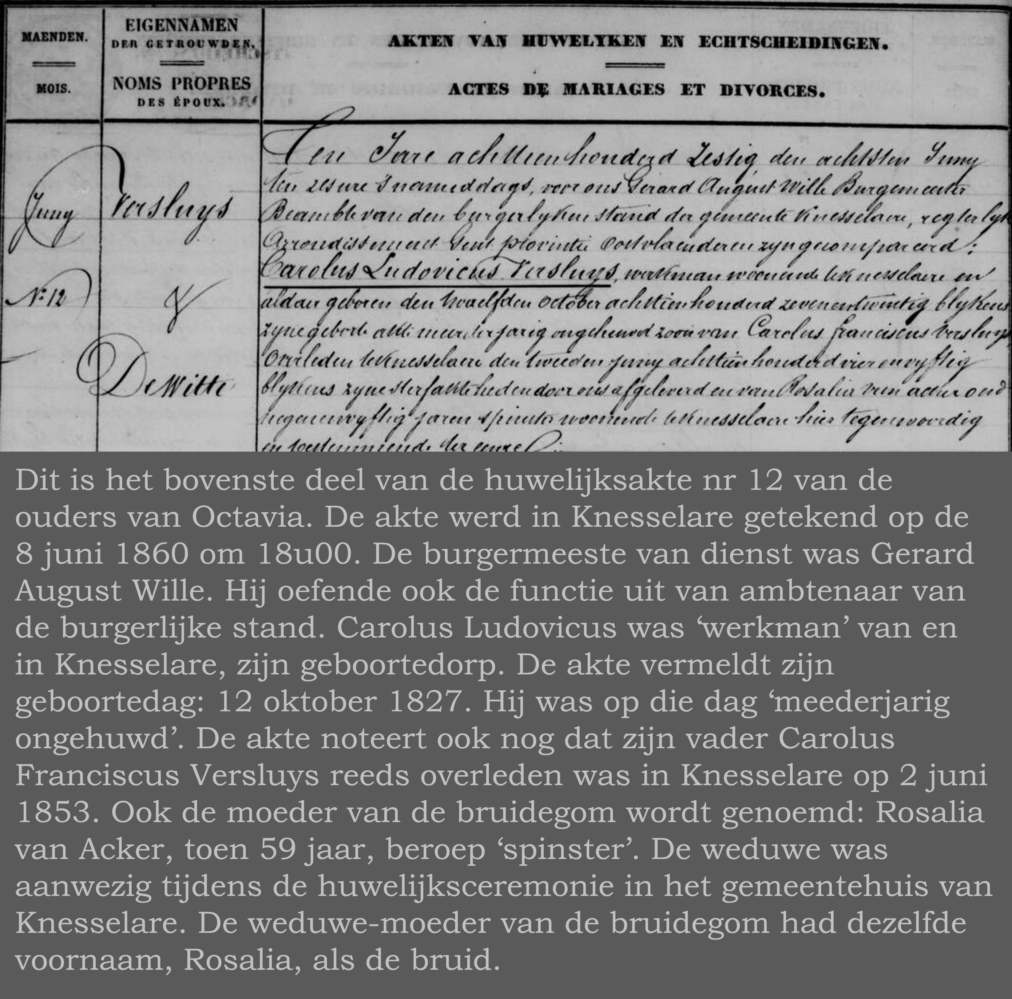 We beschikken over verschillende officiële stukken die betrekking hebben op de ouders en de voorouders van Octavia versluys. Met de akten van de vaderlijke afstamming van het geslacht Versluys in Knesselare keren we ver terug in de tijd. De voorstelling van de akten verloopt van dichtbij naar veraf.