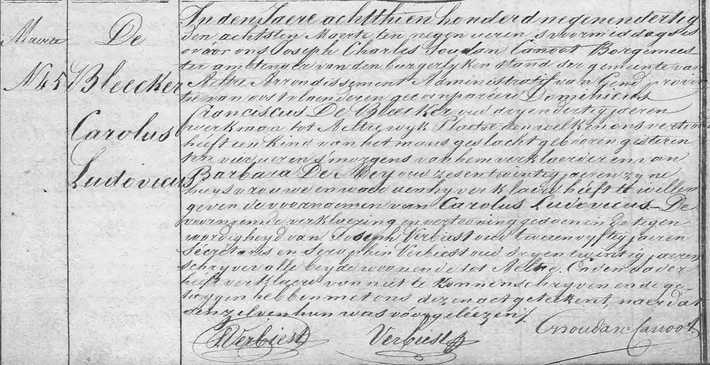 In den Jaere achtthien honderdnegenendertig den achtsten maerte ten negen uren ’s voormiddags is voor ons Joseph Charles Soudan Canoot Borgemeester ambtenaer van den burgelyken stand der gemeente van Aalter Arrondissement Administratif van Gent provincie van oost-vlaenderen gecompareerd Dominicus Franciscus De Bleecker oud dryen dertig jaeren, werkman, tot Aeltre wijk Plaetse den welken ons vertoond heeft een kind van het mans geslacht geboren gisteren vier uren ’s morgens van hem verklaerder en van Barbara Den Mey oud zesentwintig jaeren zijne huysvrouwe en waeraan hij verklaerd heeft te willen geven de voornaemen van Carolus Ludovicus. De voorangaende verklaerjing en vertooning gedaen in de tegenwoordigheyd van Joseph Verbiest oud tweeenvijftig jaeren secretaris en Seraphin Verbiest oud dryentwintig jaeren schrijver alle beyde woonende tot Aelter. En de vader heeft verklaerd van niet te konnende schrijven en de getuigen hebben met ons dezen ackt geteekend, naerdat denzelven hun was voorgeléezen.